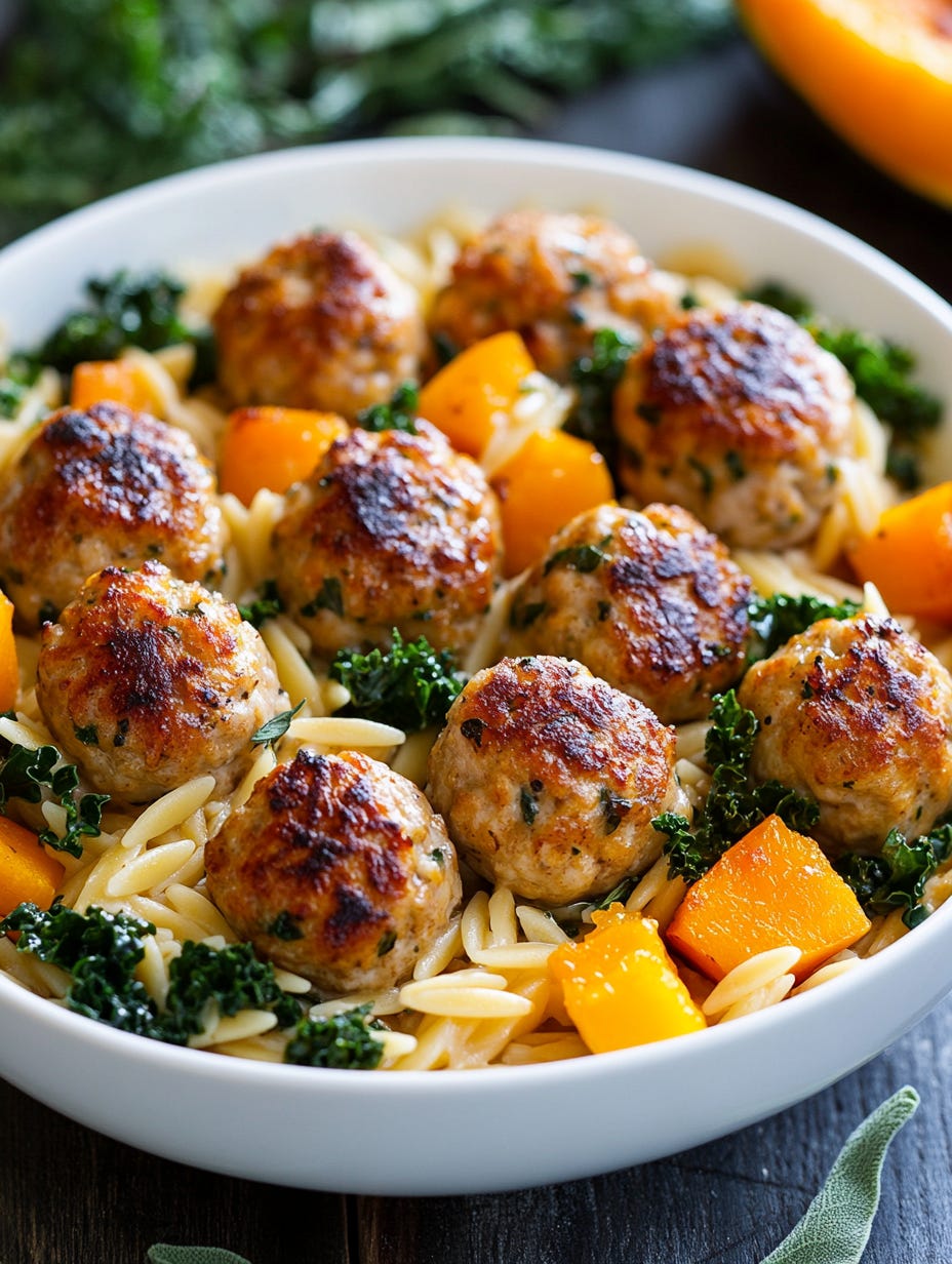 Baked Chicken Meatballs with Creamy Butternut Squash & Spiced Rum Orzo