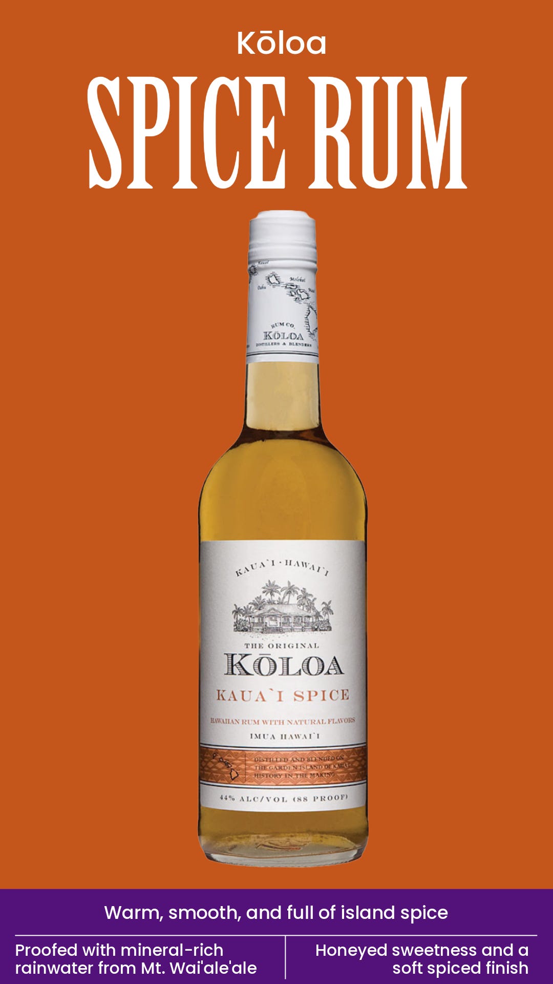 Kōloa Spice Rum begins with pure cane spirit distilled in copper pot stills. From there, it is blended with natural spices and proofed with mineral-rich mountain rainwater from Mount Waiʻaleʻale — one of the wettest places on earth.
