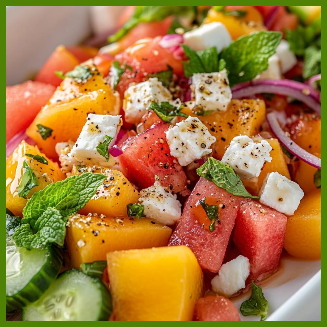 In this article, I’m sharing one of my favorite warm-weather side dishes, a recipe that’s as beautiful on the table as it is flavorful. Juicy watermelon, sweet strawberries, and golden nectarines meet crunchy cucumber, creamy feta, and fresh mint. The whole thing gets tied together with a citrusy rum vinaigrette that’s light, aromatic, and just a touch unexpected.